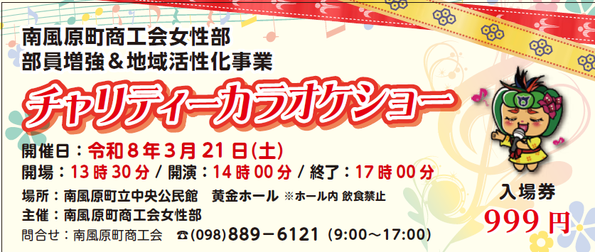 南風原町商工会女性部では、「部員増強&地域活性化事業」の一環として、下記のとおり「チャリティーカラオケショー」を開催いたします 。